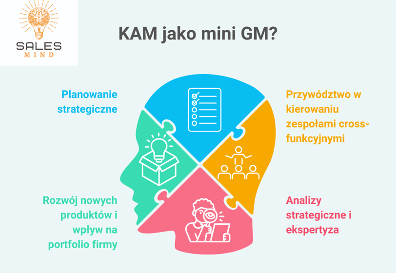 Rosnąca kompleksowość biznesu, połączona z potrzebą indywidualizacji podejścia do kluczowych klientów, doprowadziły do zmiany w modelu współpracy dostawca – klient. Poza standardowym kontaktem na poziomie KAM – Kupiec, konieczne jest zaangażowanie i zmotywowanie zespołów cross-funkcyjnych, złożonych z pracowników różnych działów m.in. Marketing, Trade marketing, Logistyka, Catman, RGM. Rolą KAM-a jako GM-a swojego klienta jest skoordynowanie tych zasobów, zmotywowanie do przeznaczenia części swojego czasu właśnie dla naszego klienta, maksymalnie wykorzystując potencjał współpracy.